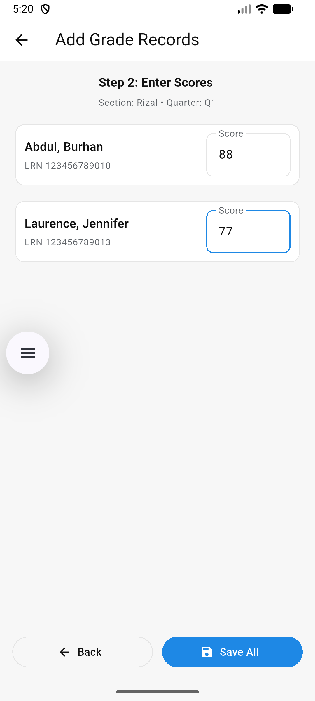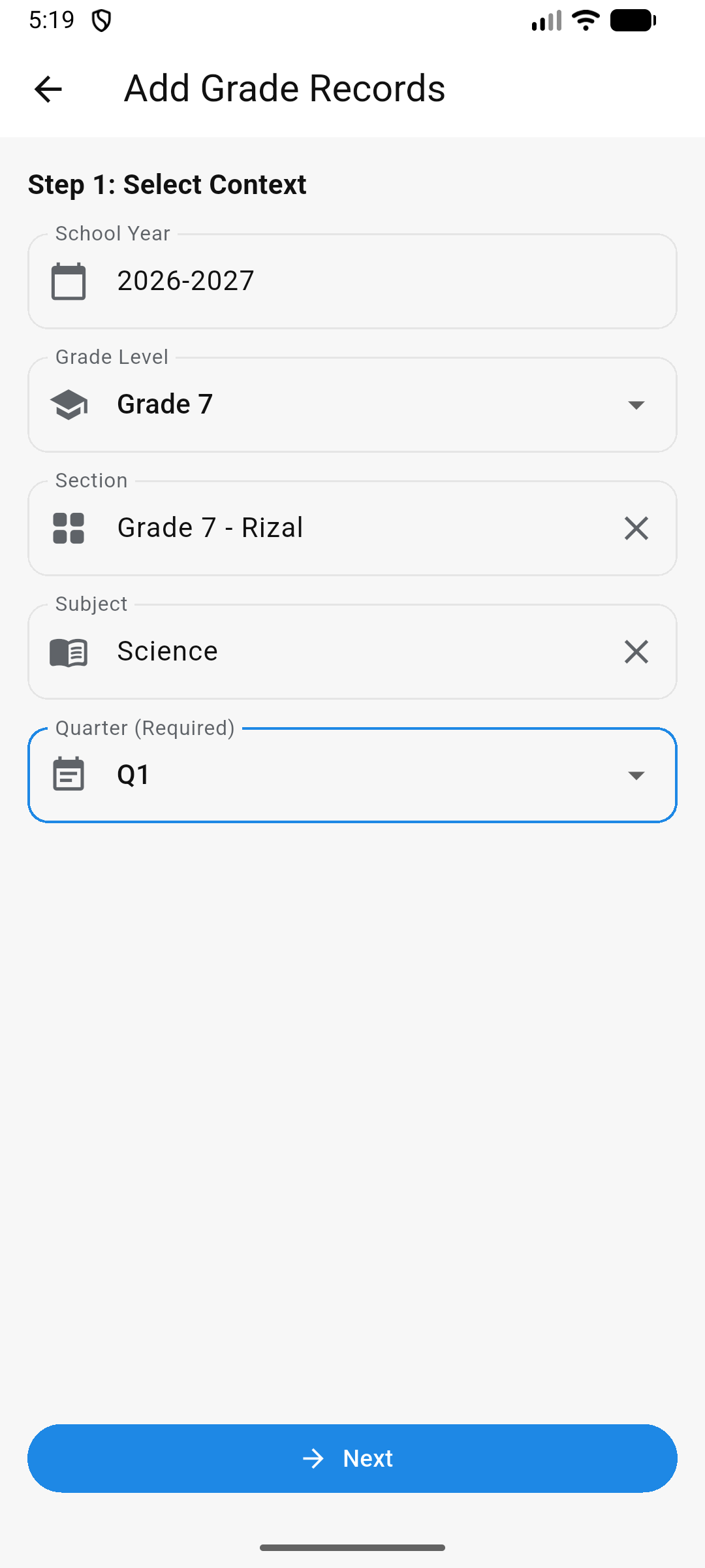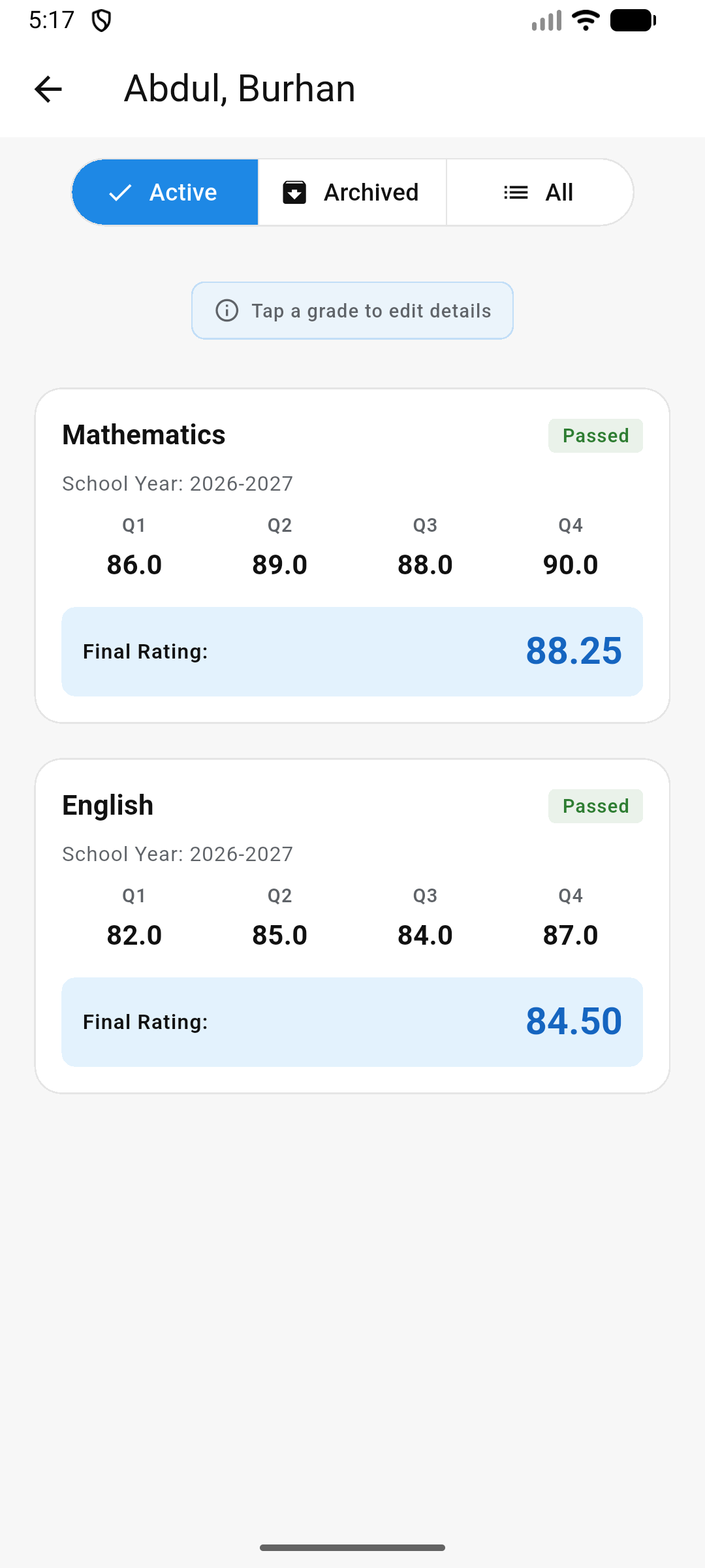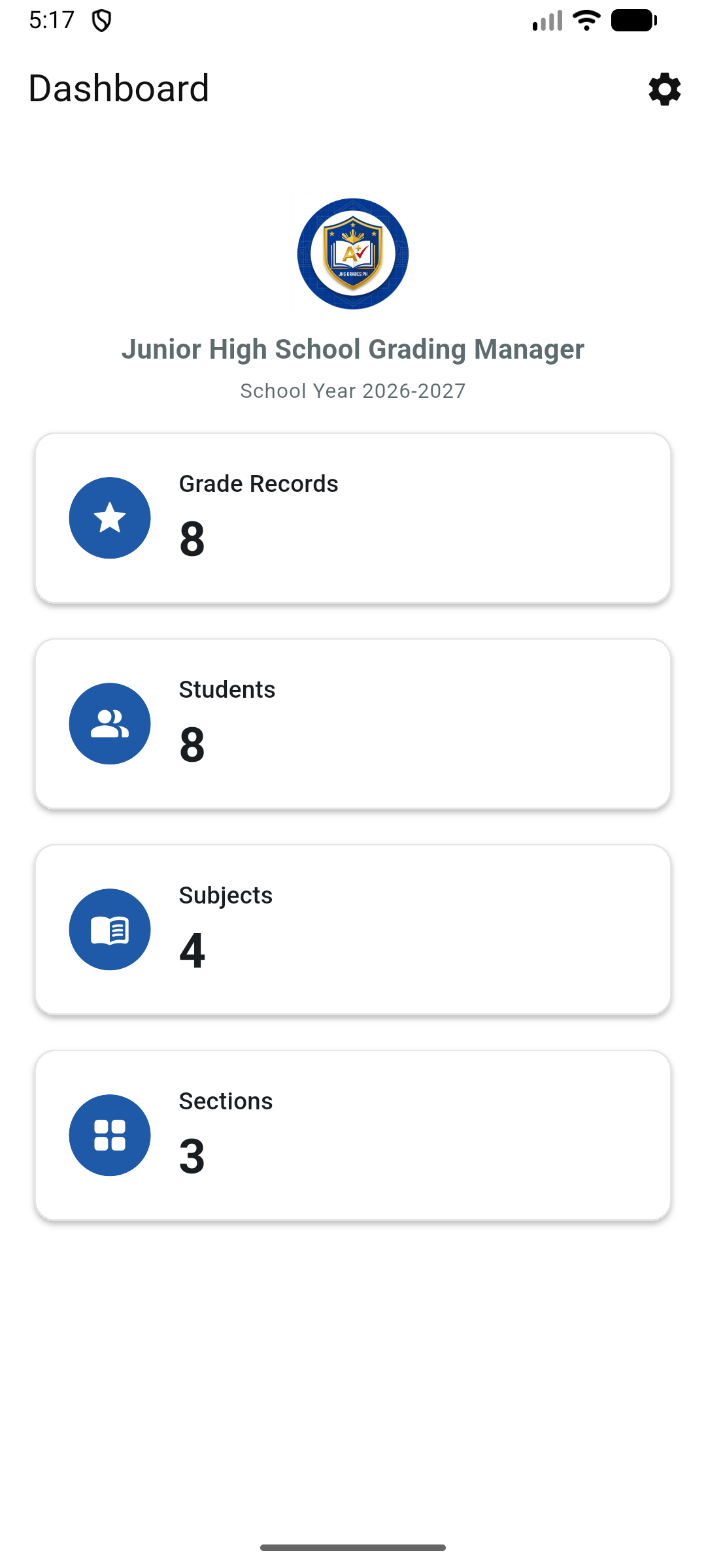 Offline junior high grading app for sections, students, subjects, and grades. Junior High School Grading Manager is a simple offline app for organizing student records and recording grades for junior high school classes. Use it to manage sections, students, and subjects in one place, then enter quarterly grades and review each student's final rating for the selected school year. The app is designed for quick local record-keeping with a clean dashboard and easy-to-manage lists. With built-in support for Grade 7 to Grade 10 workflows, the app helps teachers and school staff keep class data organized without needing an internet connection or a complicated setup. What you can do inside the app: - Create and manage sections by grade level and adviser - Add and organize student profiles with LRN and section assignment - Set up subjects with grading component weights - Enter quarterly grades for Q1, Q2, Q3, and Q4 - Automatically view final rating and pass/fail status - Filter records by school year - Archive and restore records when needed - Start quickly with optional sample data This app is ideal for schools or teachers who want a focused grading tool for day-to-day use without relying on constant connectivity. Key Features: - Offline-first grade management - Dashboard for grade records, students, subjects, and sections - Student management with LRN, grade level, and section - Subject management with grading weights - Bulk grade entry for quarterly records - Automatic final rating calculation - Passed, Failed, and Pending status tracking - School year filtering - Archive and restore support for records - Optional sample data for quick setup Who Is It For: - Junior high school teachers - Class advisers - School registrars or academic staff - Small schools needing a simple local grading tool - Users handling Grade 7 to Grade 10 records Notes: - No special permissions are required beyond standard app functionality. MacOS and iOS coming soon!
